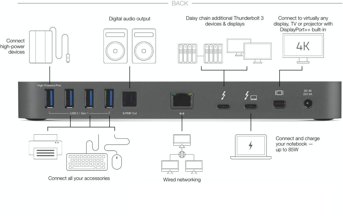 - Two Thunderbolt 3 ports (one for the host, one for daisy-chaining)
